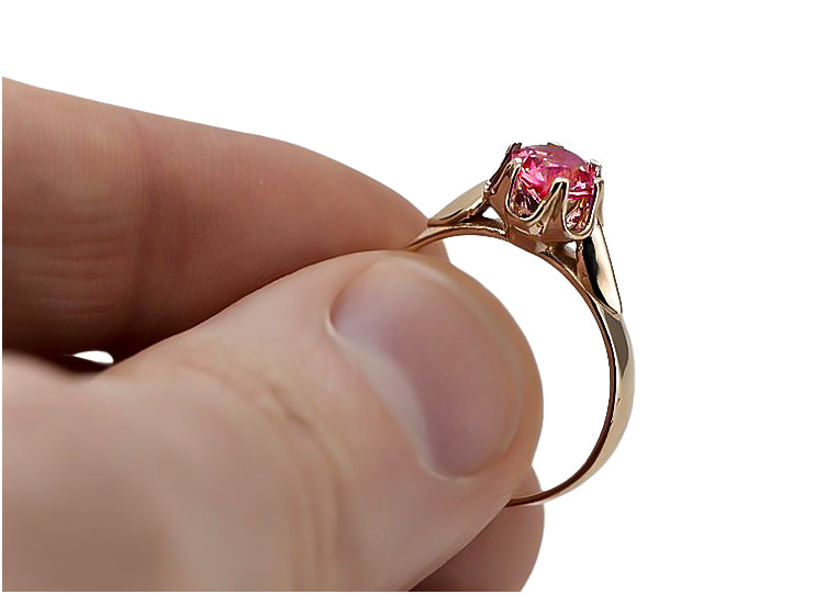 Embrace the allure of a bygone era with this exquisite 14k Rose Gold Ruby Ring, a true embodiment of vintage elegance. This stunning piece of Russian vintage jewelry whispers tales of romance and sophistication, crafted with meticulous attention to detail. A timeless treasure, this ruby ring is a captivating symbol of enduring love and refined taste.