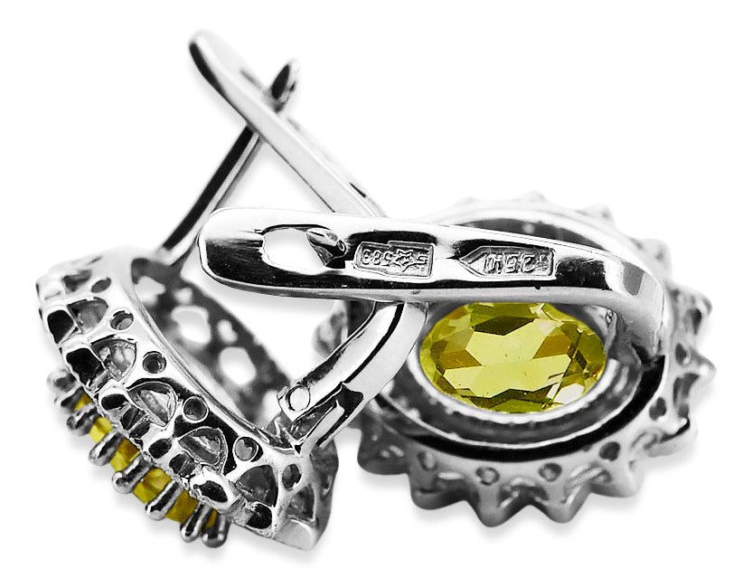 Indulge in the allure of a bygone era with these exquisite 14k white gold vintage earrings, a testament to the enduring elegance of Russian Soviet jewelry. These earrings, adorned with vibrant peridot stones and shimmering cubic zirconia, capture the spirit of romance and sophistication. A true embodiment of luxury gold jewelry, they are a timeless treasure to be cherished for generations.