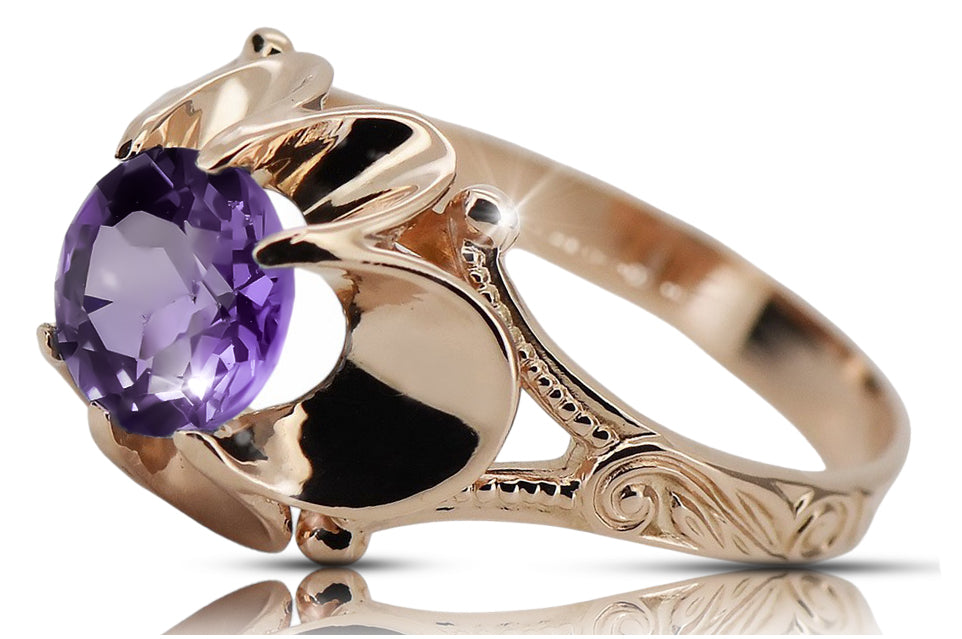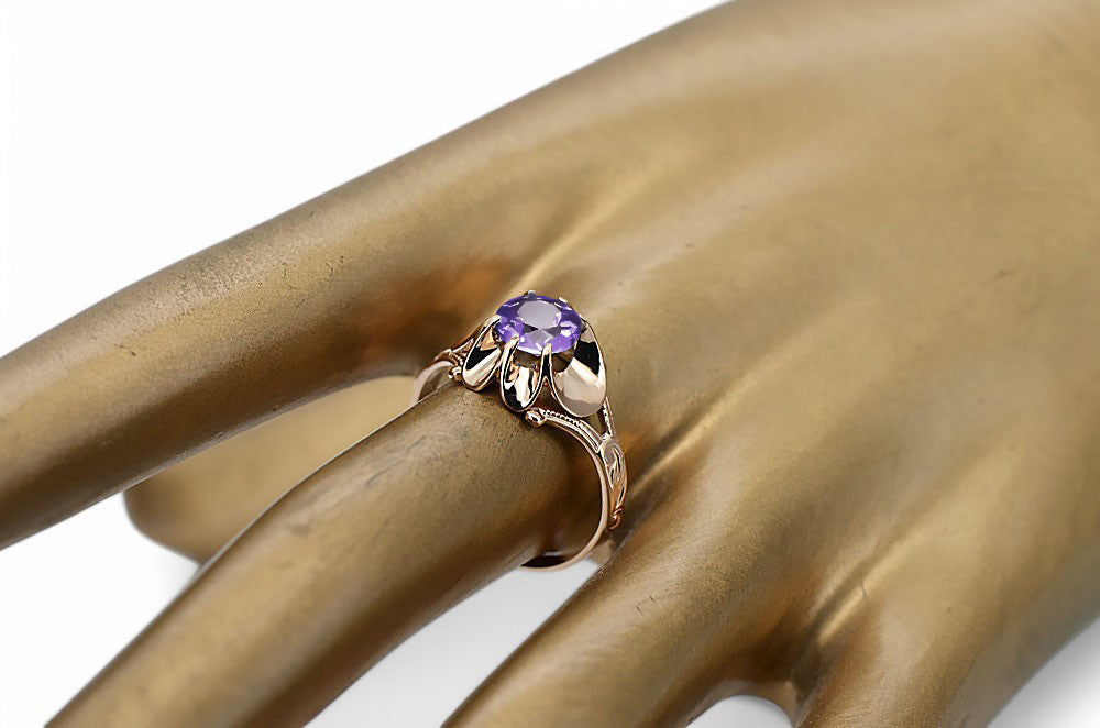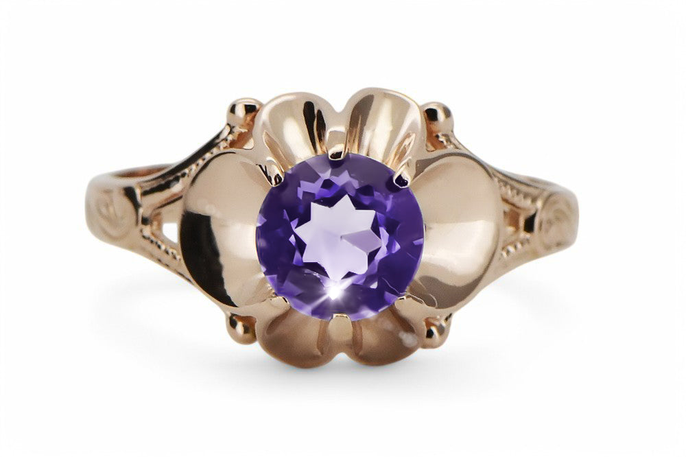Embrace the allure of a bygone era with this exquisite Alexandrite Original Vintage 14K Rose Gold Ring, a testament to the enduring elegance of Russian vintage jewelry. This captivating piece, bearing the prestigious Sickle & Hammer hallmark, whispers tales of Soviet craftsmanship and timeless beauty. A rare find, this ring is more than just jewelry; it's a piece of history, ready to adorn your finger with a touch of regal sophistication.