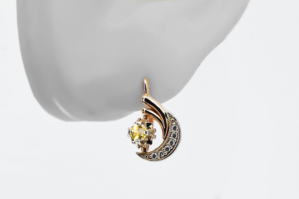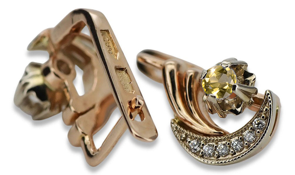 Embrace the allure of a bygone era with these exquisite Vintage Style Yellow Peridot Earrings. A testament to enduring beauty and meticulous craftsmanship, these earrings seamlessly blend the warmth of 14K rose gold with the brilliance of white gold, creating a captivating piece of Russian vintage jewelry. Each earring whispers tales of Soviet artistry, offering a glimpse into the opulent world of luxury gold jewelry.