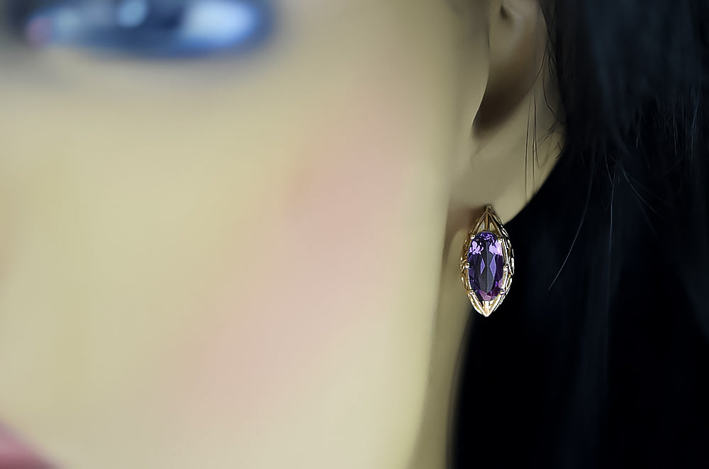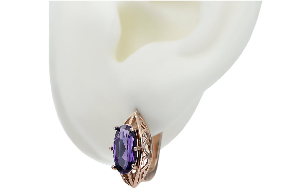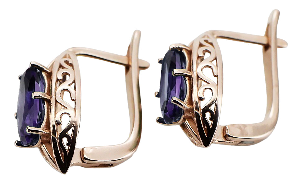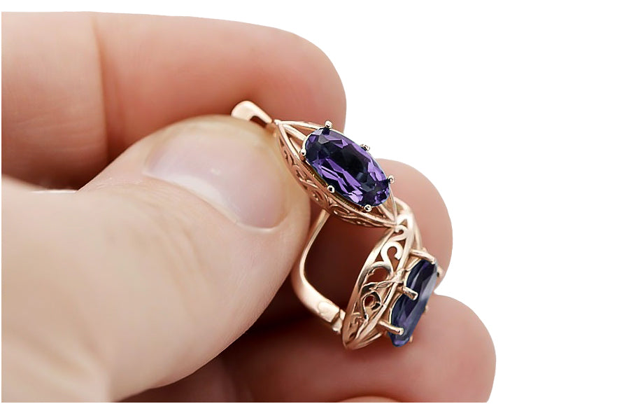 Adorn your ears with the captivating allure of these Rose Pink 14k Gold Alexandrite Earrings, a treasure from the Soviet era. This exquisite piece of Russian vintage jewelry embodies the elegance and timeless craftsmanship of a bygone era, perfect for adding a touch of historical glamour to any ensemble. Discover the enchanting beauty and vibrant hues of these unique earrings, a testament to the enduring legacy of luxury gold jewelry.