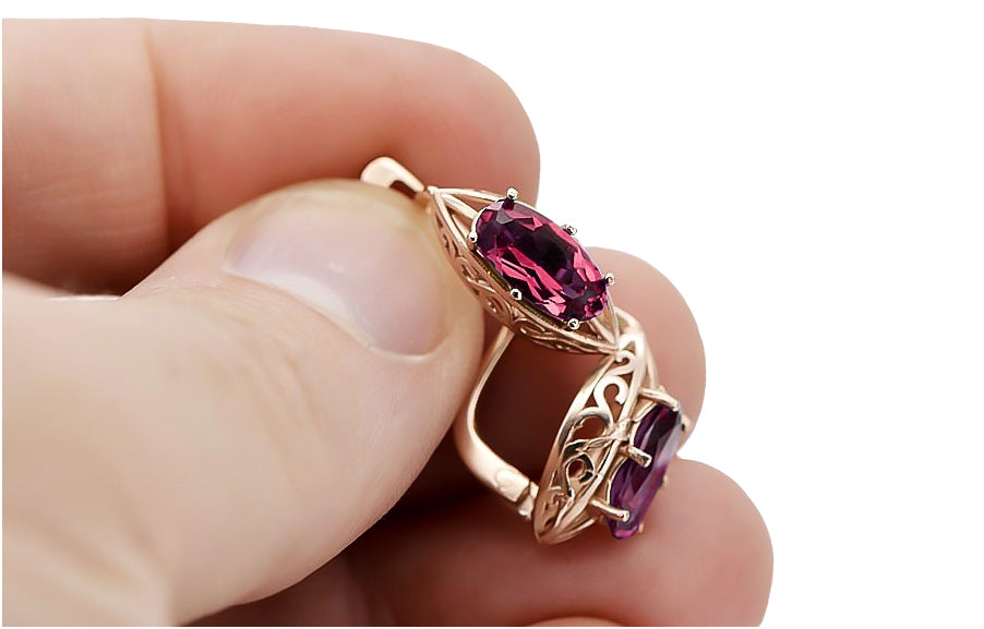 Embrace the allure of a bygone era with these exquisite Rose Pink 14k Gold Ruby Earrings, a testament to the enduring beauty of Russian vintage jewelry. These earrings capture the essence of Soviet-era craftsmanship, offering a glimpse into a world of refined elegance and timeless style. Own a piece of history and adorn yourself with the grace and sophistication of these stunning ruby and gold treasures.