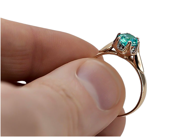 Capture the allure of a bygone era with this exquisite Rose Pink 14K Gold Emerald Ring, a true testament to Soviet craftsmanship. This piece of Russian vintage jewelry whispers tales of romance and timeless elegance, embodying the spirit of a romantic era. Each detail, from the warm rose gold to the captivating emerald, speaks of enduring beauty and refined taste. Discover a touch of history with this authentic vintage treasure.